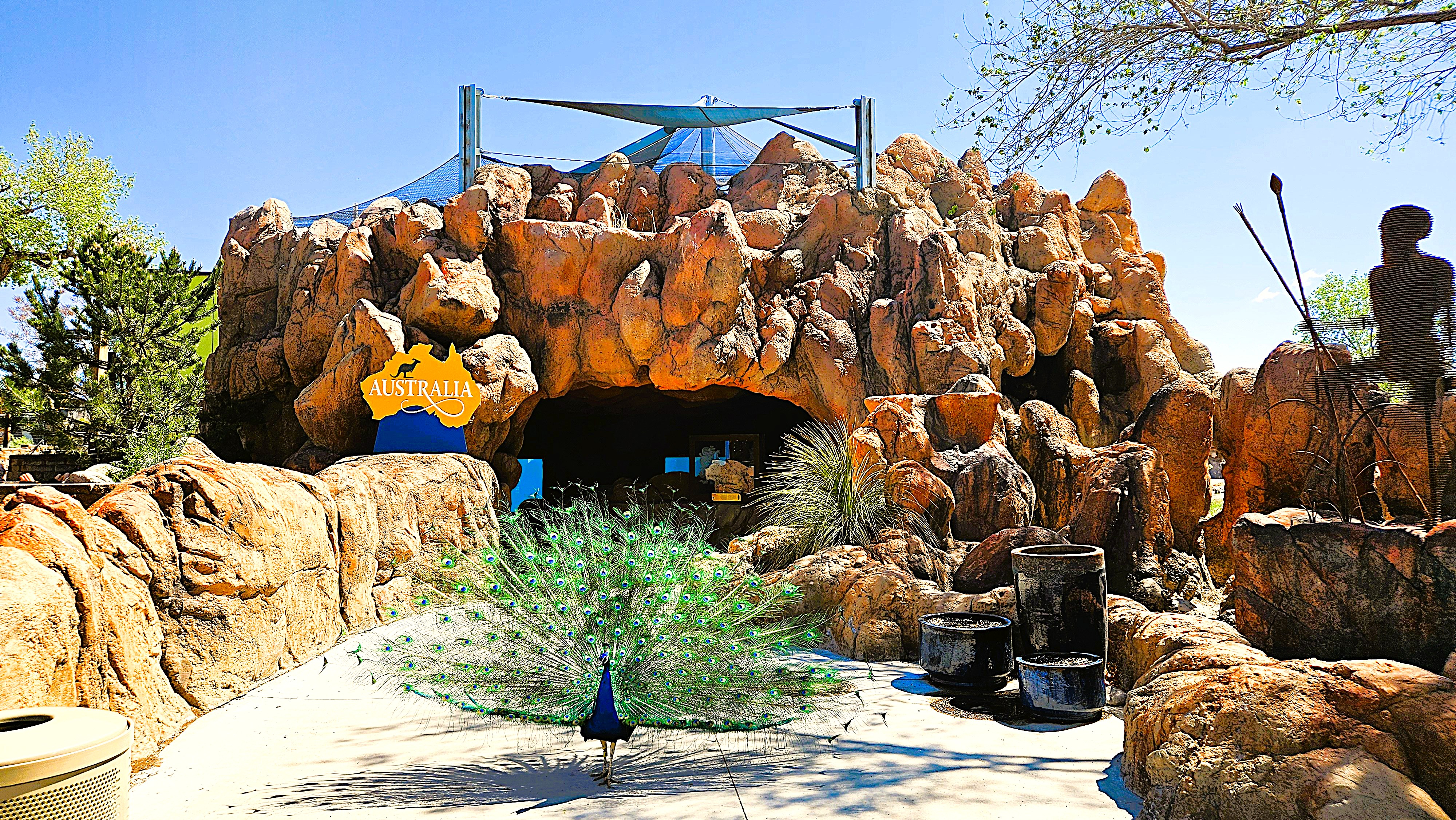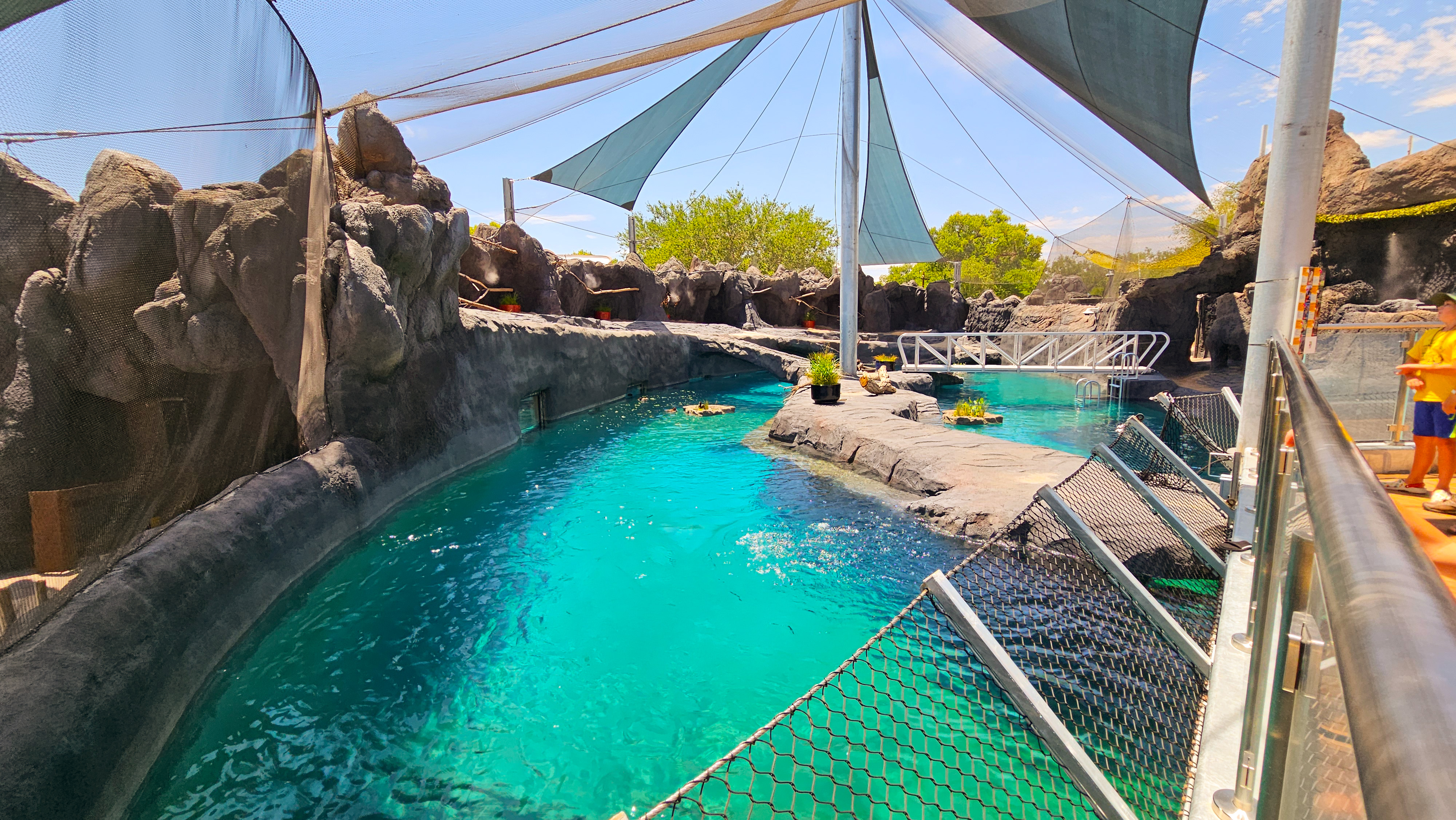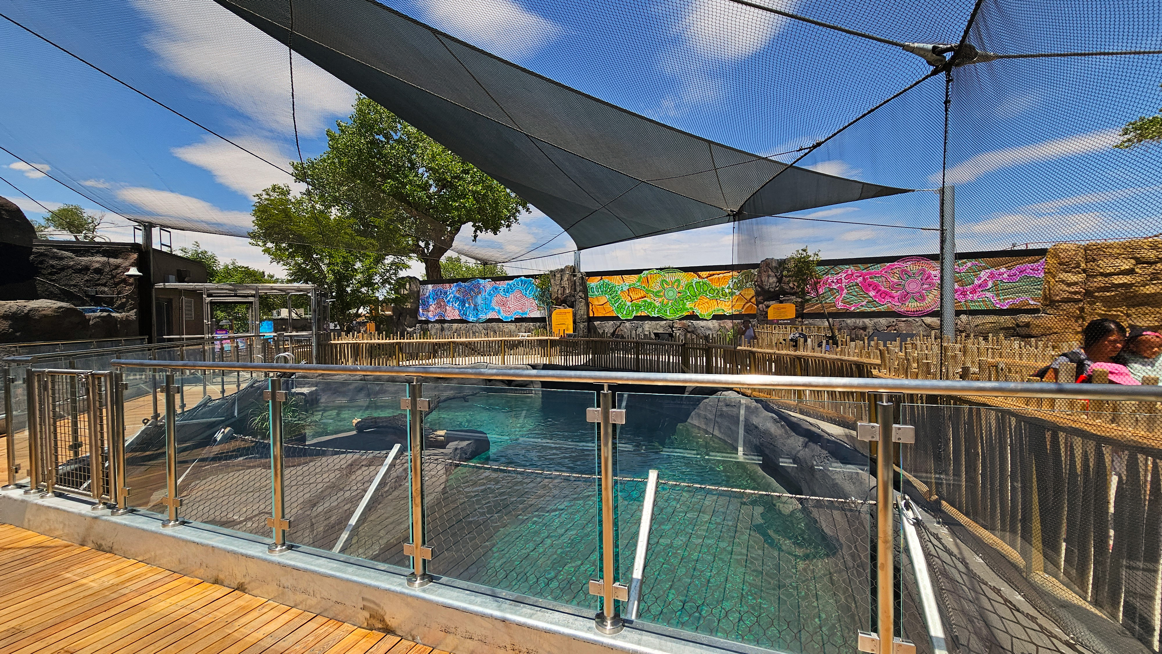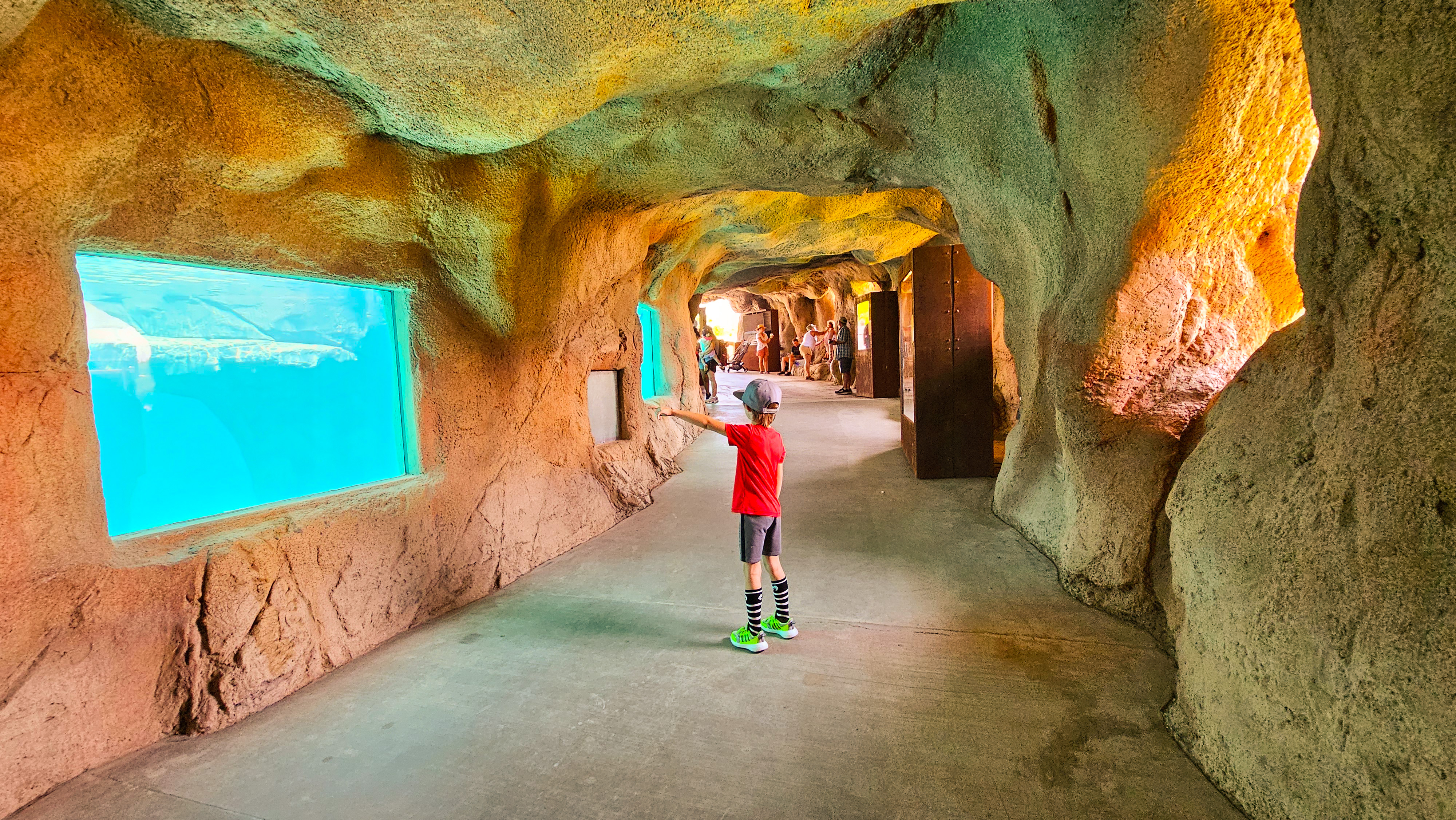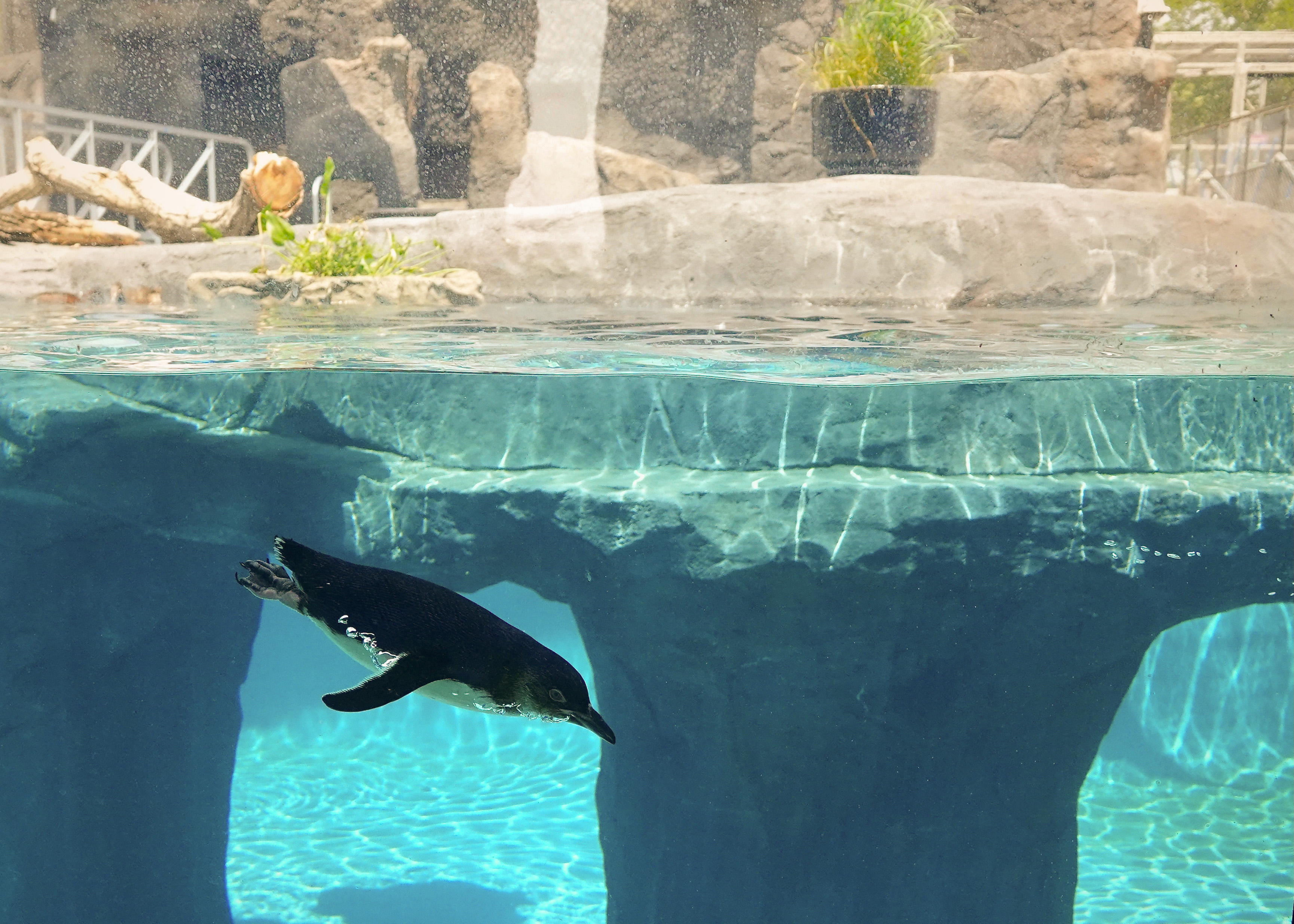 This exhibit features a new cave entrance adorned with murals, welcome statues, landscaping, and storytelling through audio and video. It is an open aviary showcasing little blue penguins and flying seabirds, set in the “Saltwater Country” section of the experience. The area includes themed rockwork, vegetation, a new overwater bridge, and an underwater viewing area.