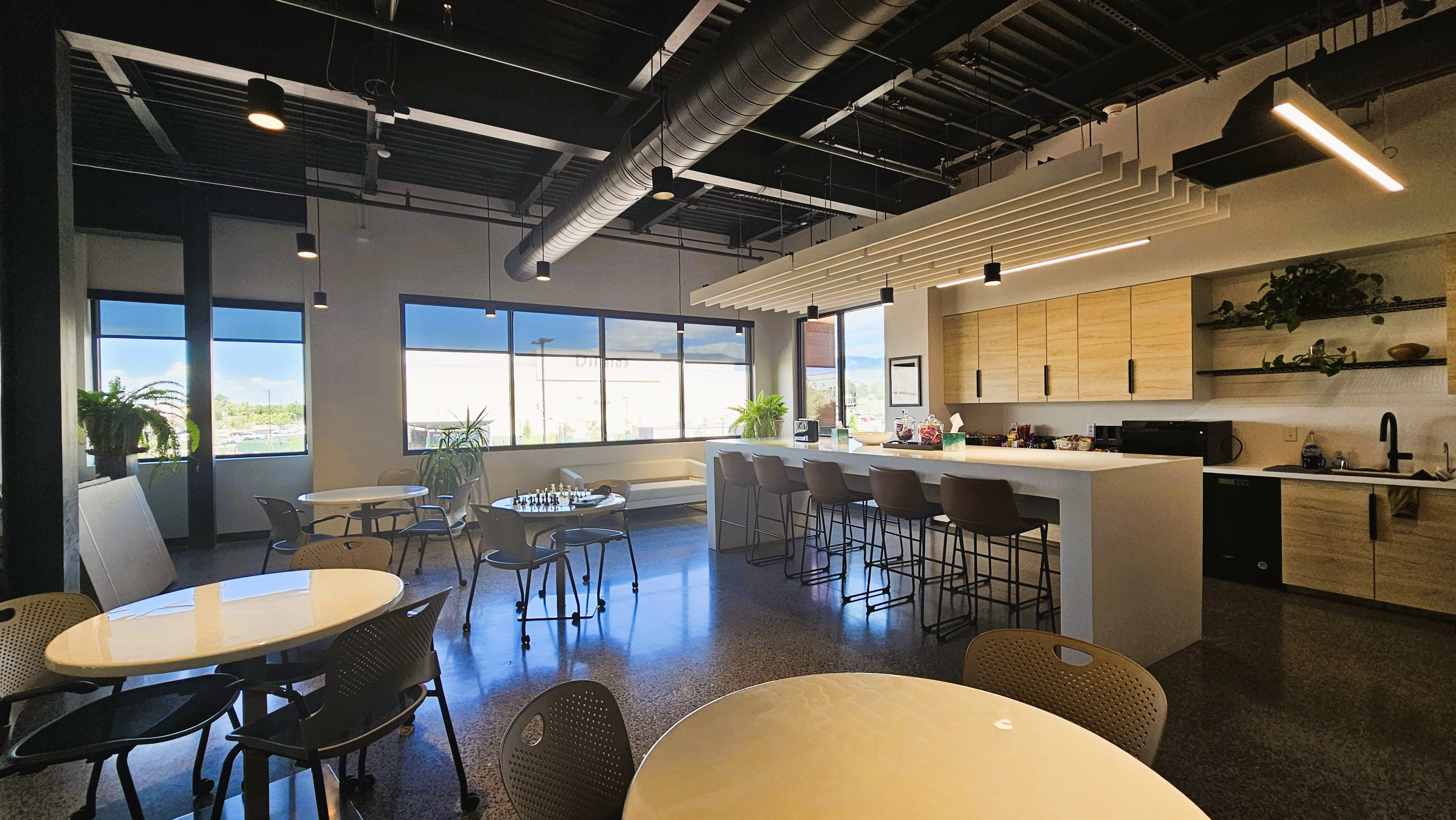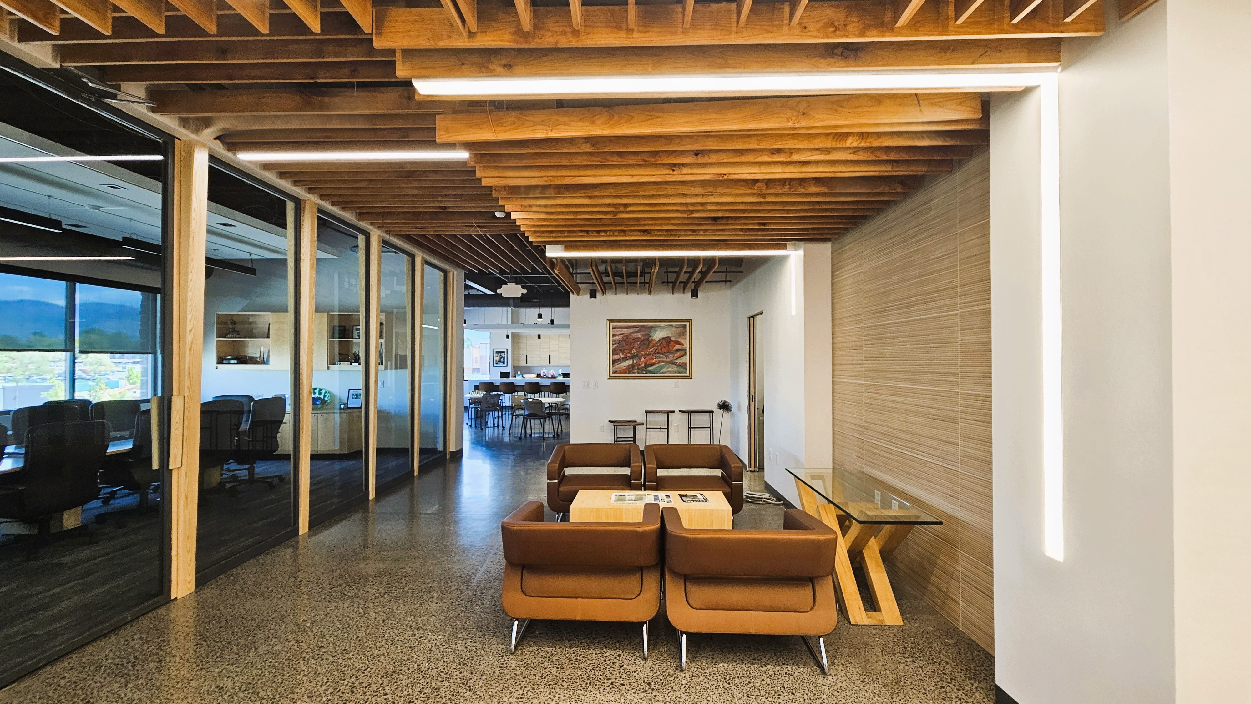 The executive office conveys presence and sophistication with a conference table, comfortable seating area, integrated display, and amazing view of the Sandia Mountains. Offices are optimized for virtual meetings with layered front-facing lighting, acoustic consideration, and clean, professional Zoom backgrounds using neutral textures like wood, stone, art and simple shelving. Additional spaces strengthen culture and connection, including a café with integrated utilities and a collaborative ideation area with large whiteboards—avoiding large cubicle zones in favor of flexible spaces that encourage teamwork and creativity and support collaboration and idea generation.