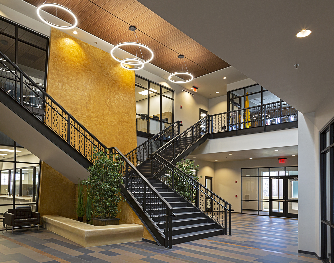 The Administration Building is a one stop shop for multiple County departments. The design concept utilizes a naturally lit public central corridor to create an “Avenida” similar to an alley way you might duck into in downtown Santa Fe. This Avenida creates a public thoroughfare that allows equal access from both the pedestrian entrance from the plaza side and the new parking garage. The Avenida is flanked by a 2nd floor balcony with decorative steel stairs and railings and the varuous department “storefronts” that overlook the shared public lobby below, and provides controlled public access to the departments. The plan provides a separate employee access to minimize the congestion and provide security. The design provides fixed walls along the “Avenida”, around the core program of restrooms and elevators, as well as partitions between departments. This open plan provided the design team the flexibility of layout within each department.
